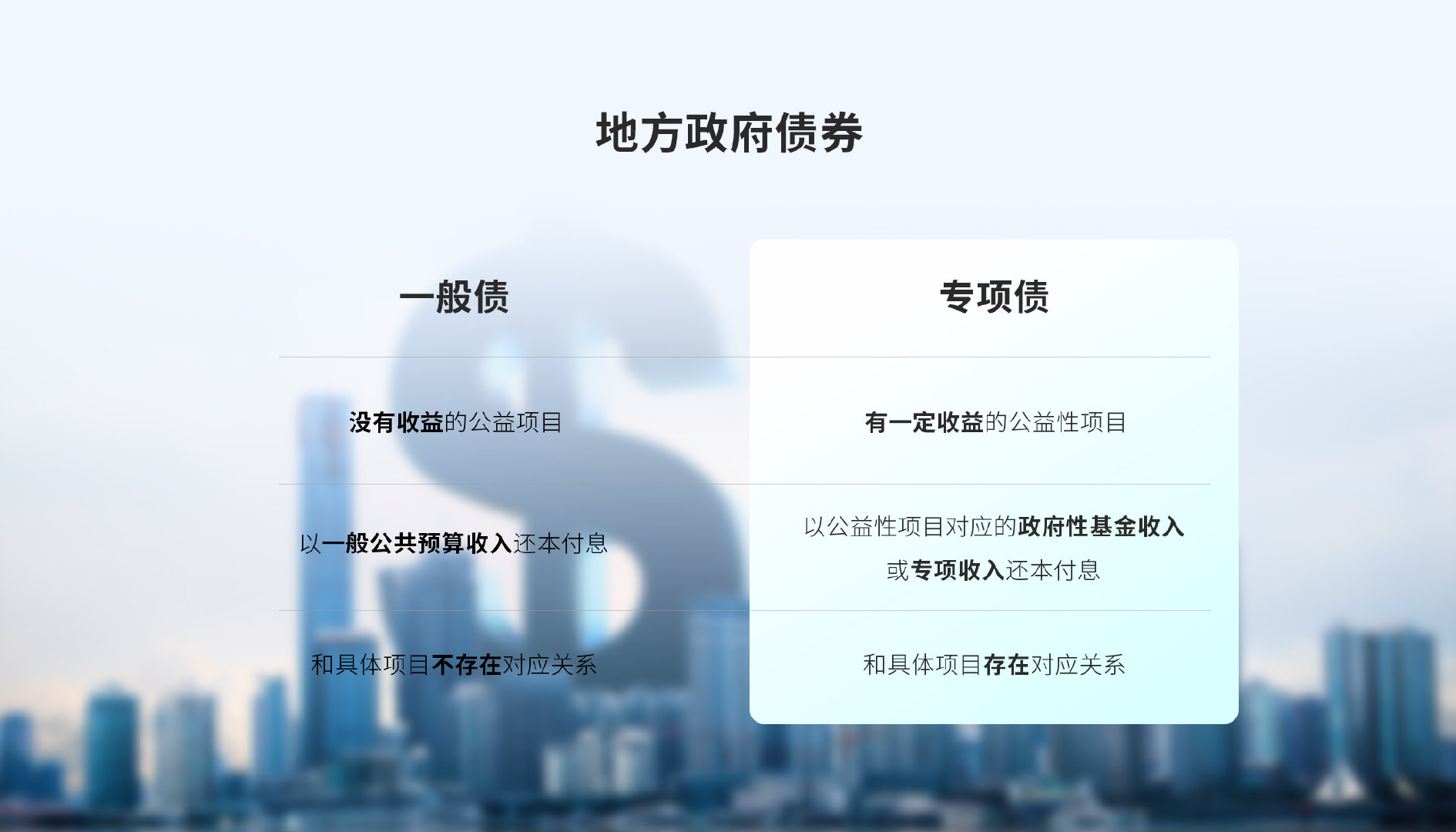 一般債運用于沒有收益的公益性項目,是以一般公共預算收入還本付息的,和具體項目不存在對應(yīng)關(guān)系,也就是說,不需要具體問題、具體分析;