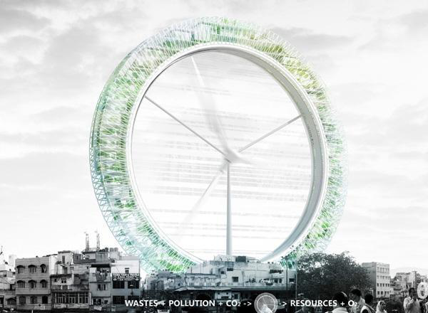 循環(huán)中心是一個(gè)大型的風(fēng)力渦輪,像一個(gè)大肺一樣,轉(zhuǎn)動(dòng)在新德里城市中心,能量及二氧化碳通過摩天輪里的植物、化學(xué)過濾器、微小顆粒的膜結(jié)構(gòu)、高空溫室和礦化設(shè)備將氧氣釋放到城市上空。