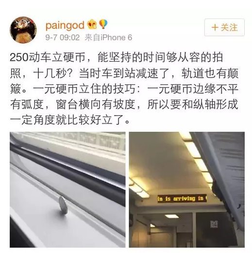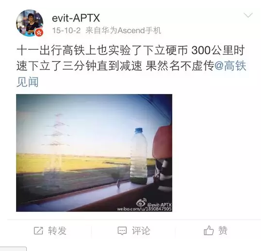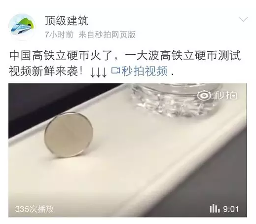 各路中國(guó)網(wǎng)友開始踴躍證明,用一元硬幣在高鐵上做起了立硬幣實(shí)驗(yàn)(一元人民幣厚度是1.85毫米),結(jié)果硬幣依然傲然挺立,表示毫無(wú)壓力。