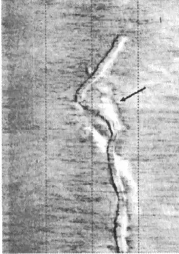 本實例為上海京海工程技術(shù)公司上級單位中國地質(zhì)科學(xué)院物化探研究所采用側(cè)掃聲納探測得到的資料。圖5是一段裸露于海底面上的電纜的側(cè)掃聲納圖像。該電纜為多年前采用水力噴射埋設(shè)方式鋪設(shè),但是由于鋪設(shè)時未能準(zhǔn)確的將該電纜放入噴射出的溝槽內(nèi),從而導(dǎo)致該電纜露在海底面上。