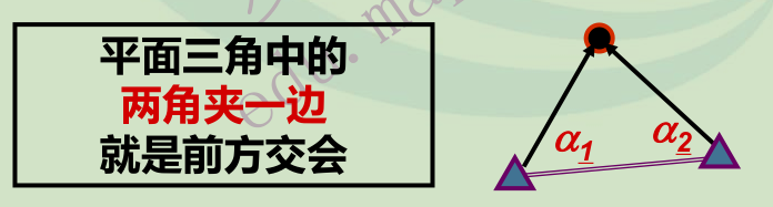 在測量中:前方交會是在兩個已知點(diǎn)1、2上,安置經(jīng)緯儀,對未知點(diǎn)A測定水平角、垂直角,就能測得未知點(diǎn)坐標(biāo)A(X、Y、Z)。