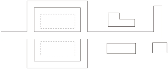 道路主要平行于主要建筑、構(gòu)筑物,圍繞各庫房進(jìn)行布置,這種道路布置形式受地形條件限制,一般不宜在山區(qū)丘陵地區(qū)采用,且道路的總長度及占地較多,對(duì)于交通繁忙、車流和人流組織需要分離的采用,如圖所示。