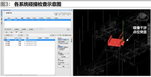 5.參照后的項目文件參照完成后可在項目中進行各系統(tǒng)模型的碰撞檢查(如圖3),預先檢查出各干涉點位,把問題解決在設(shè)計的初級階段,減少后期的返工和整改,從而保證項目設(shè)計質(zhì)量,減少整個項目的運營成本。