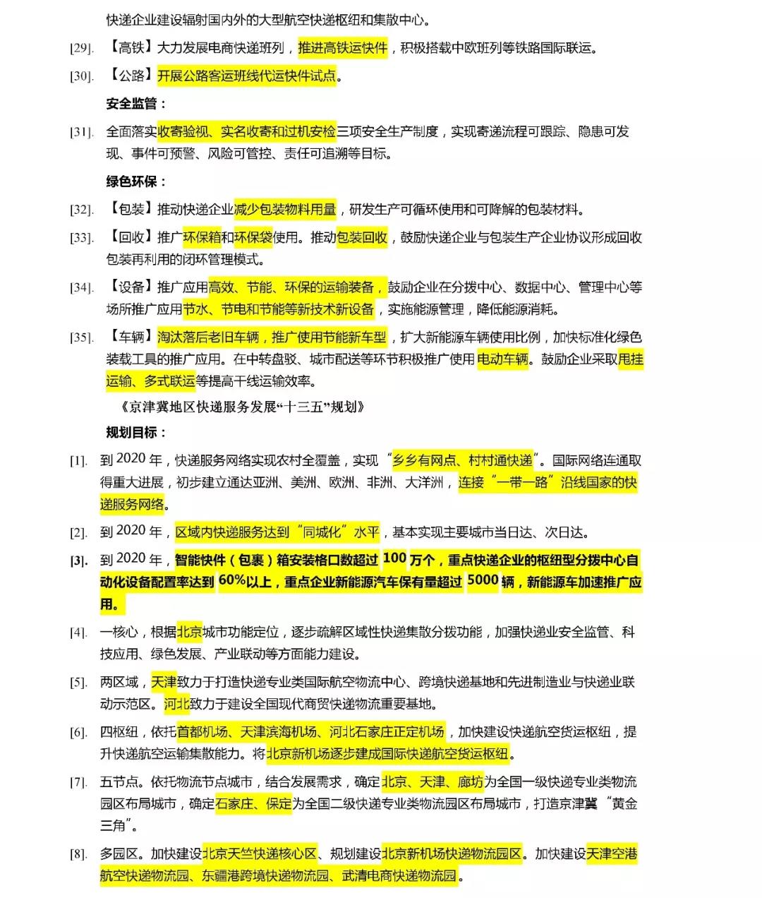 (3)到2020年,京津翼地區(qū),智能快件(包裹)箱安裝格口數(shù)超過100萬個,重點快遞企業(yè)的樞紐型分撥中心自動化設(shè)備配置率達到60%以上,重點企業(yè)新能源汽車保有量超過5000輛,新能源車加速推廣應(yīng)用。