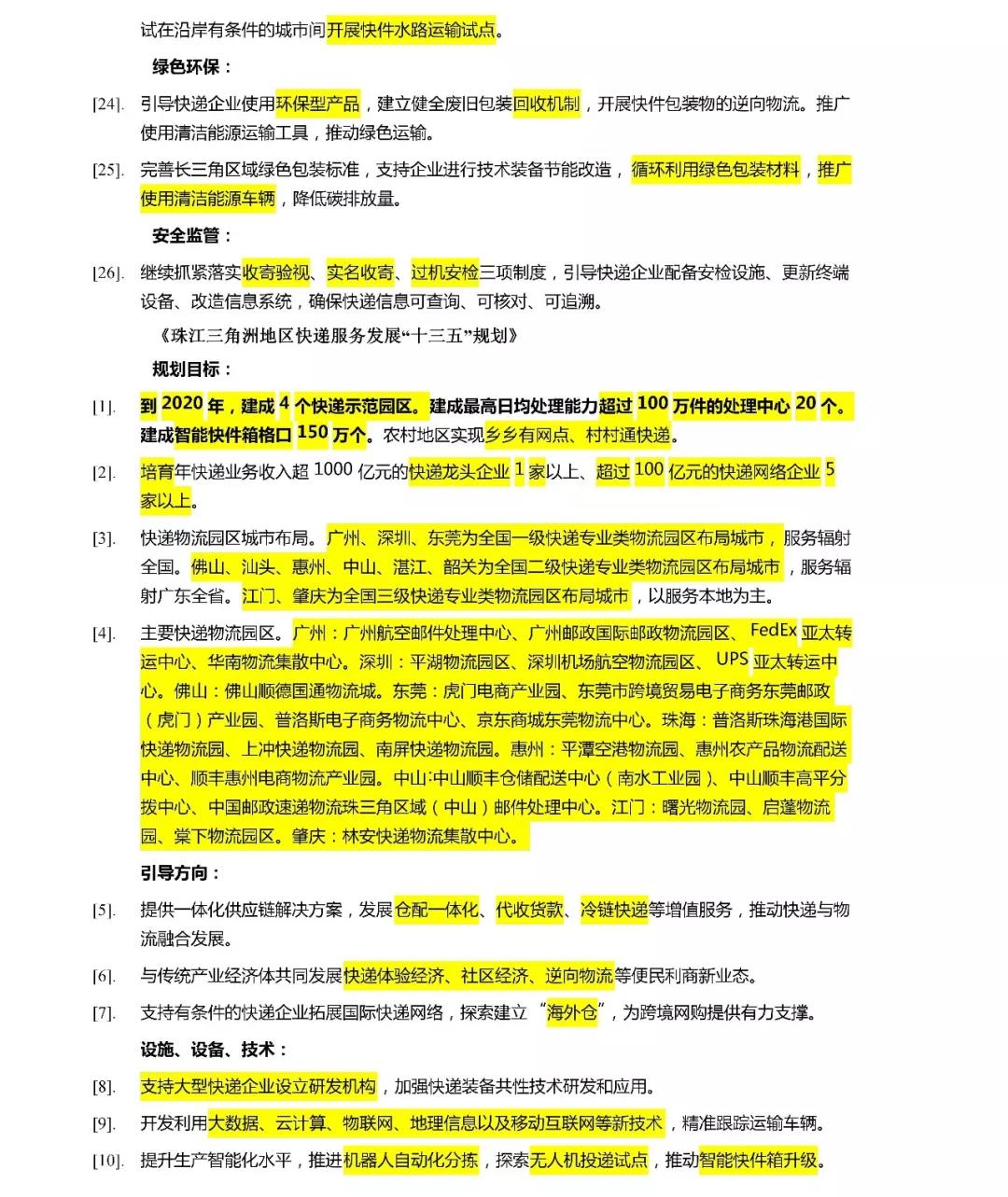 (5)到2020年,珠三角地區(qū),建成4個快遞示范園區(qū)。建成最高日均處理能力超過100萬件的處理中心20個。建成智能快件箱格口150萬個。