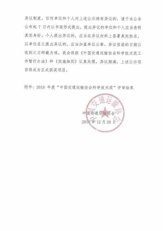 2018年度“中國交通運輸協(xié)會科學技術獎”評審結果公示