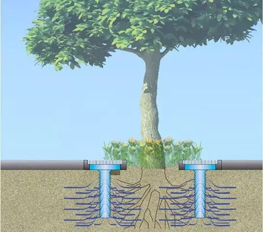 樹(shù)池的標(biāo)高一般比路面低一些,用以收集、初步過(guò)濾雨水徑流。就行道樹(shù)而言,一系列連貫的樹(shù)池可以被設(shè)計(jì)成潛在的收水裝置,最大限度地發(fā)揮收集、過(guò)濾雨水徑流的作用。