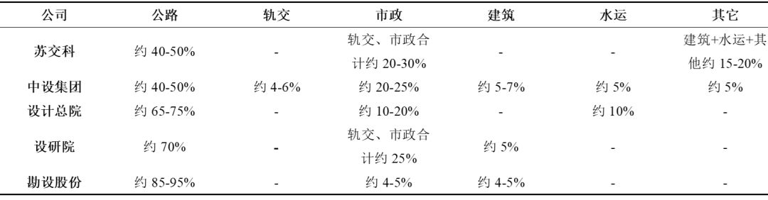主要基建設(shè)計(jì)公司目前基建細(xì)分設(shè)計(jì)業(yè)務(wù)占比對(duì)比:公路設(shè)計(jì)較高