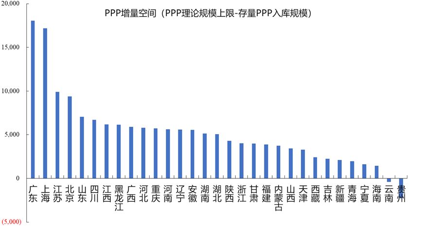 我們基于地方財(cái)政基礎(chǔ)測(cè)算PPP潛在空間。從整體來(lái)看,估算的大多數(shù)省份PPP項(xiàng)目潛在總增量均為正值,但區(qū)域數(shù)據(jù)差異較大。東部沿海發(fā)達(dá)省份PPP項(xiàng)目潛在增量規(guī)模最大,而中西部省份相對(duì)較小。