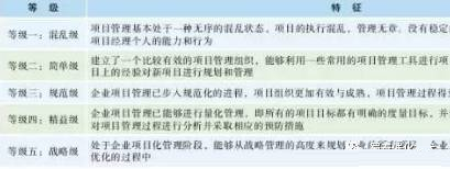 設(shè)計(jì)院向工程公司轉(zhuǎn)型升級,需要提升管理能力,如項(xiàng)目管理能力、商務(wù)和法律能力、專業(yè)采購和分包管理能力、信息化建設(shè)和運(yùn)用能力等,這都是擺在傳統(tǒng)設(shè)計(jì)院面前的新課題。特別是項(xiàng)目管理能力的打造,是能否實(shí)現(xiàn)轉(zhuǎn)型的關(guān)鍵,只有真正具備了較為完善的項(xiàng)目管理能力,企業(yè)才能以工程公司模式順暢運(yùn)作。根據(jù)項(xiàng)目管理理論,企業(yè)的項(xiàng)目管理能力可分為5個(gè)等級,見表1。