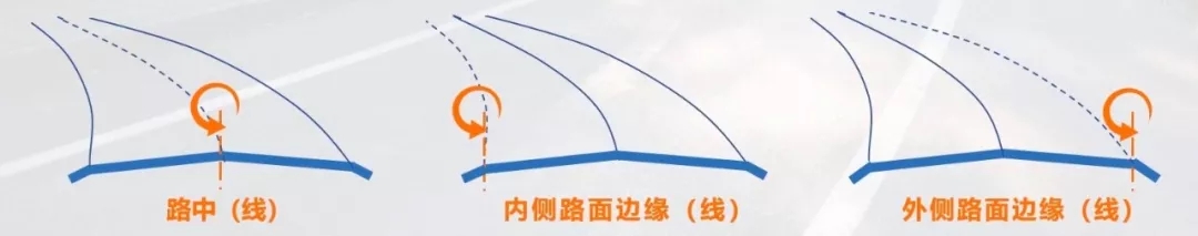 另外一個就是軸線,為了保證超高過渡的平穩(wěn)連續(xù),需要在路面的三個軸線,也就是路中線、內(nèi)存路面邊緣線或外側(cè)路面邊緣線將路面進(jìn)行旋轉(zhuǎn)。從而達(dá)到雙向橫坡果斷到單向橫坡的目的。