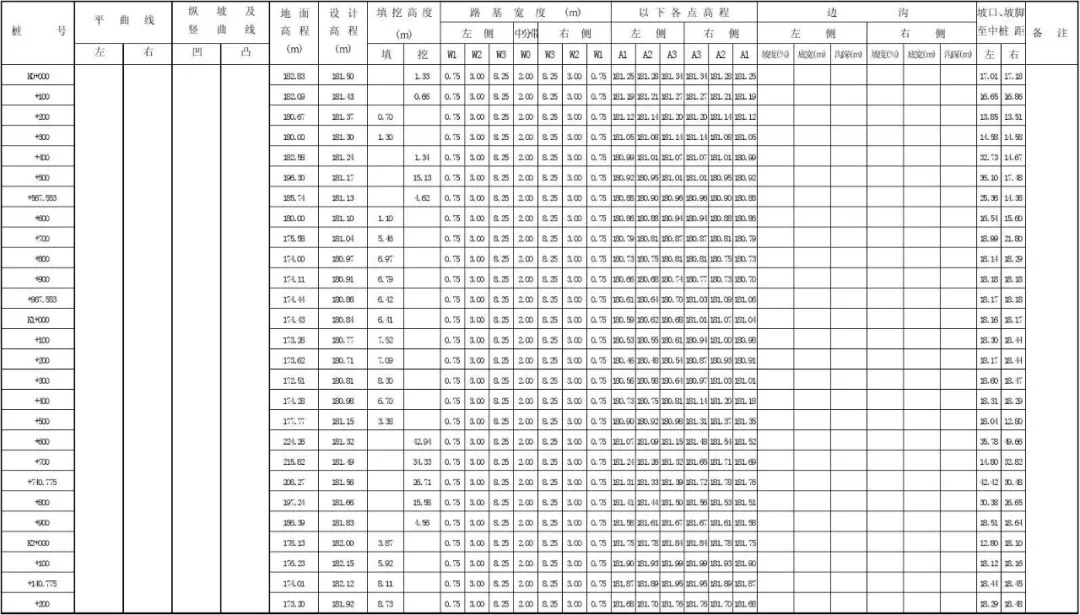 路基設(shè)計表:為便于施工,平曲線設(shè)計超高后,道路中線和內(nèi)、外側(cè)(路肩)邊緣線與設(shè)計高程之差應(yīng)列于路基設(shè)計表中。計算時需要按照超高過渡段、全超高段分別計算中線、內(nèi)緣及外緣的高程。