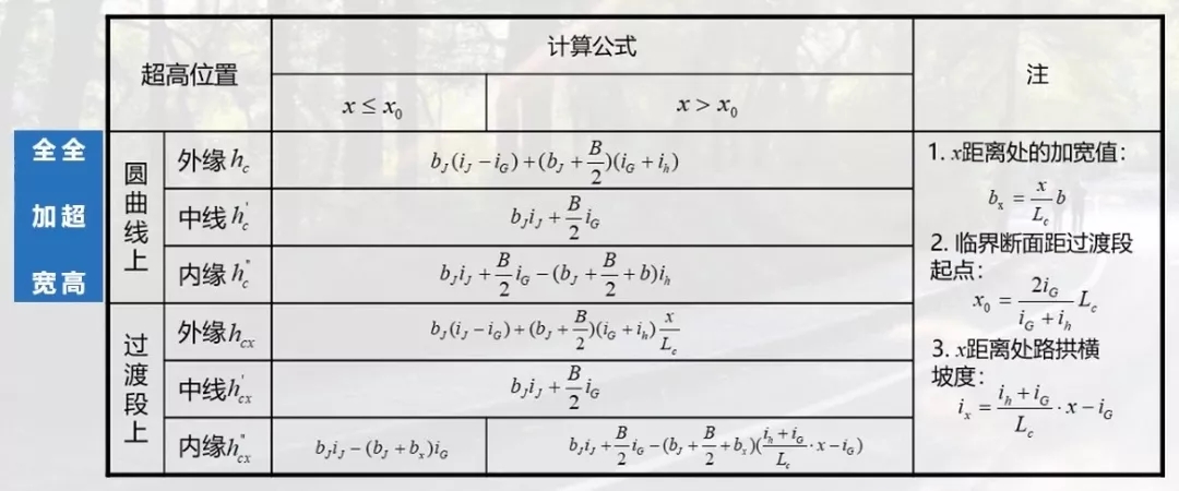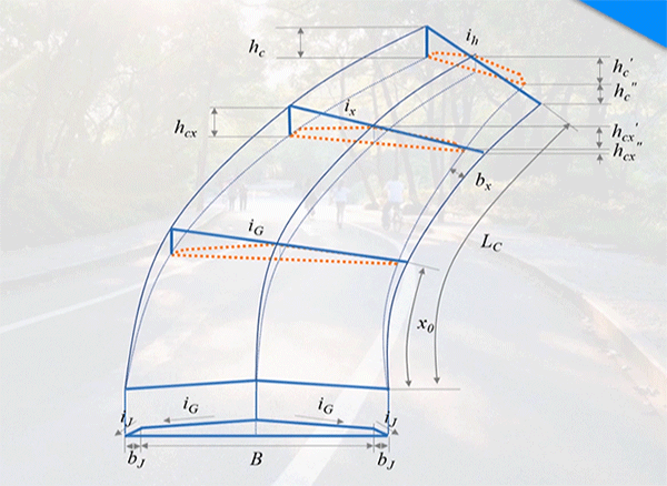 雖然超高計算圖示里有很多參數(shù),但是大家需要了解其中三個重要的參數(shù),分別是ix(x距離處路拱橫坡度)、bx(x距離處路基加寬值)和x0(與路拱同坡度的單向超高點到超高過渡段起點距離)。