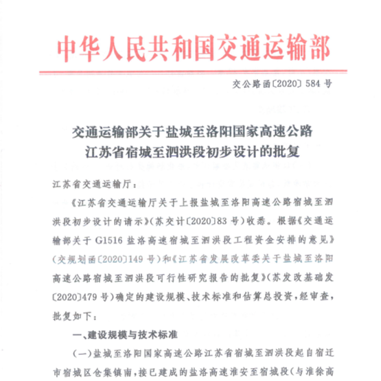 鹽洛高速公路宿城至泗洪段初步設(shè)計獲交通運(yùn)輸部批復(fù)