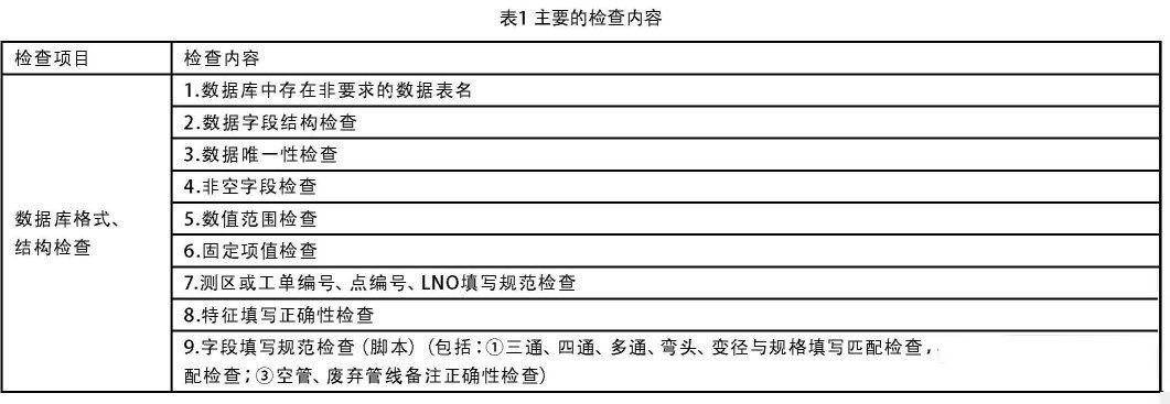 目前,全國(guó)各管線單位要求生產(chǎn)單位提交的數(shù)據(jù)集一般是Microsoft Office Access數(shù)據(jù)庫(kù)的mdb文件.數(shù)據(jù)庫(kù)格式、結(jié)構(gòu)檢查主要檢查管線數(shù)據(jù)庫(kù)中的數(shù)據(jù)表是否齊全是否存在多余的表、表的字段名和數(shù)據(jù)類型是否正確、字段值的填寫(xiě)格式是否符合規(guī)程的要求等.主要的檢查內(nèi)容見(jiàn)表1: