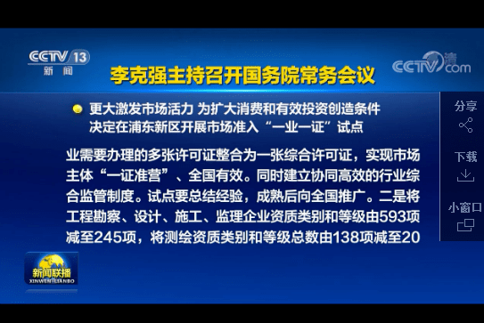 國(guó)務(wù)院總理李克強(qiáng)11月11日主持召開國(guó)務(wù)院常務(wù)會(huì)議,聽取國(guó)務(wù)院第七次大督查情況匯報(bào),確保政策落實(shí),更好發(fā)揮促進(jìn)經(jīng)濟(jì)穩(wěn)定恢復(fù)的重要作用;決定在浦東新區(qū)開展市場(chǎng)準(zhǔn)入“一業(yè)一證”試點(diǎn),在全國(guó)大幅壓減建設(shè)工程企業(yè)和測(cè)繪資質(zhì)并加強(qiáng)監(jiān)管,更大激發(fā)市場(chǎng)活力,為擴(kuò)大消費(fèi)和有效投資創(chuàng)造條件。