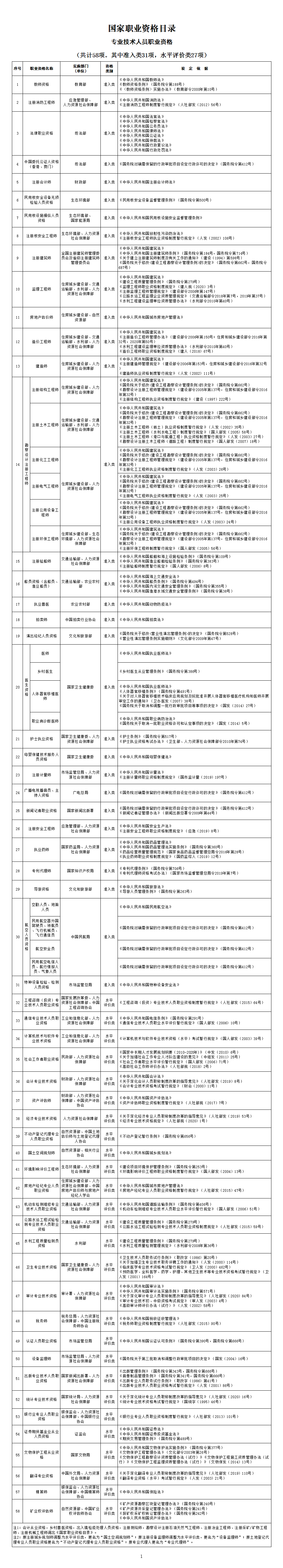 注1:會(huì)計(jì)從業(yè)資格,鄉(xiāng)村獸醫(yī)資格,出入境檢疫處理人員資格,注冊(cè)測繪師,勘察設(shè)計(jì)注冊(cè)石油天然氣工程師、注冊(cè)冶金工程師、注冊(cè)采礦/礦物工程師、注冊(cè)機(jī)械工程師調(diào)出《國家職業(yè)資格目錄》。