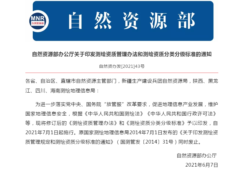 修訂版《測繪資質(zhì)管理辦法》和《測繪資質(zhì)分類分級標準》自2021年7月1日起施行