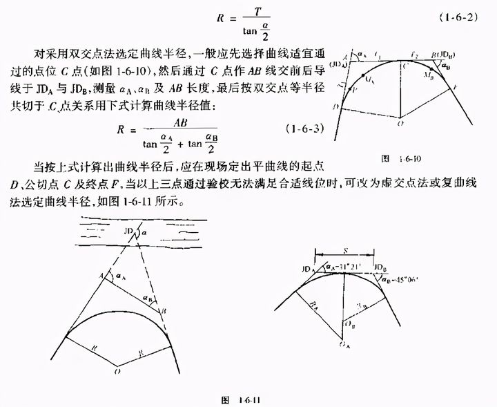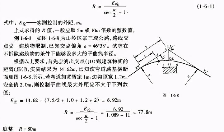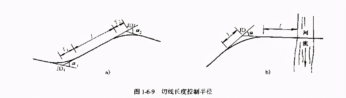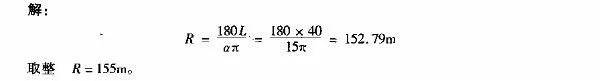 當(dāng)已知交點(diǎn)偏角.其他條件不受限制時(shí),如果平曲線半徑選得過(guò)小,則曲線長(zhǎng)度太短顯然對(duì)行車不利。此時(shí)應(yīng)用平曲線的最短允許長(zhǎng)度來(lái)控制半徑,其計(jì)算公式為