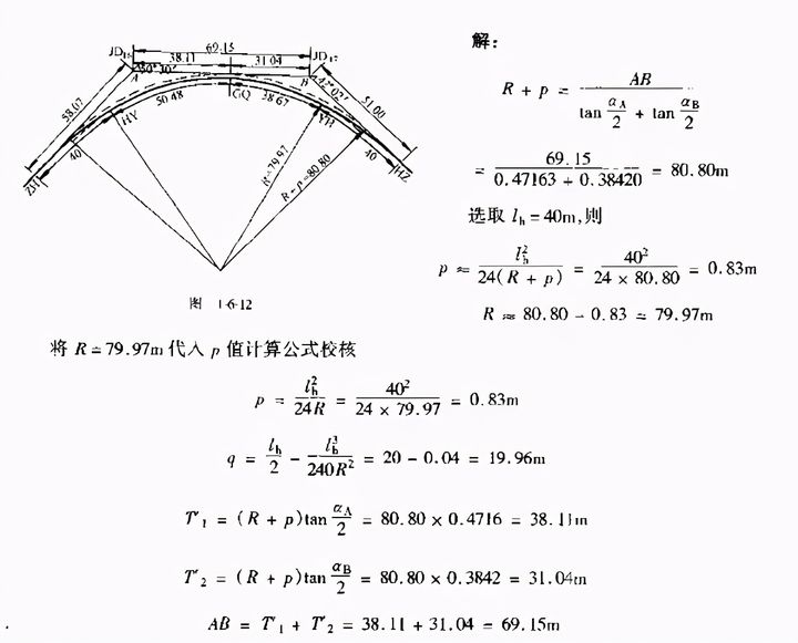例1-6-2 如圖1-6-2,JD16為雙交點(diǎn)曲線。已知aA=50°30′,aB=42°02′,AB=69.15m.試求平曲線半徑。