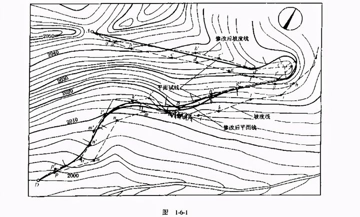 在大比例尺地形圖上,根據(jù)路線的起、終點(diǎn)和中間控制點(diǎn),仔細(xì)分析控制點(diǎn)間的地形、地質(zhì)及地物情況,選擇地勢(shì)平緩、山坡順直、河谷開(kāi)闊及有利于回頭展線的地點(diǎn)等,擬定路線各種可能的走向,完成路線的總體布局。