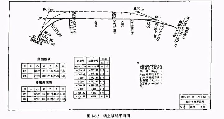 (5)根據(jù)移線起點(diǎn)與原線樁號(hào)里程的對(duì)應(yīng)關(guān)系,推算移線后各新樁的樁號(hào)里程,算出長(zhǎng)短鏈值,注在移線終點(diǎn)。