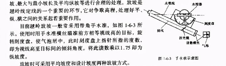 按平均坡度放坡:根據(jù)《公路工程技術(shù)標(biāo)準(zhǔn)》規(guī)定的平均坡度值5.0%—5.5%(按相對(duì)高差而定).視具體地形確定適當(dāng)?shù)目v坡度,然后實(shí)地放坡。按平均坡度放坡只起到在一定長(zhǎng)度范圍內(nèi)控制高差和水平距離的作用,優(yōu)點(diǎn)是放坡速度快,但沒(méi)有反映公路等級(jí)對(duì)平均縱坡的不同要求以及地形、地質(zhì)變化的情況。