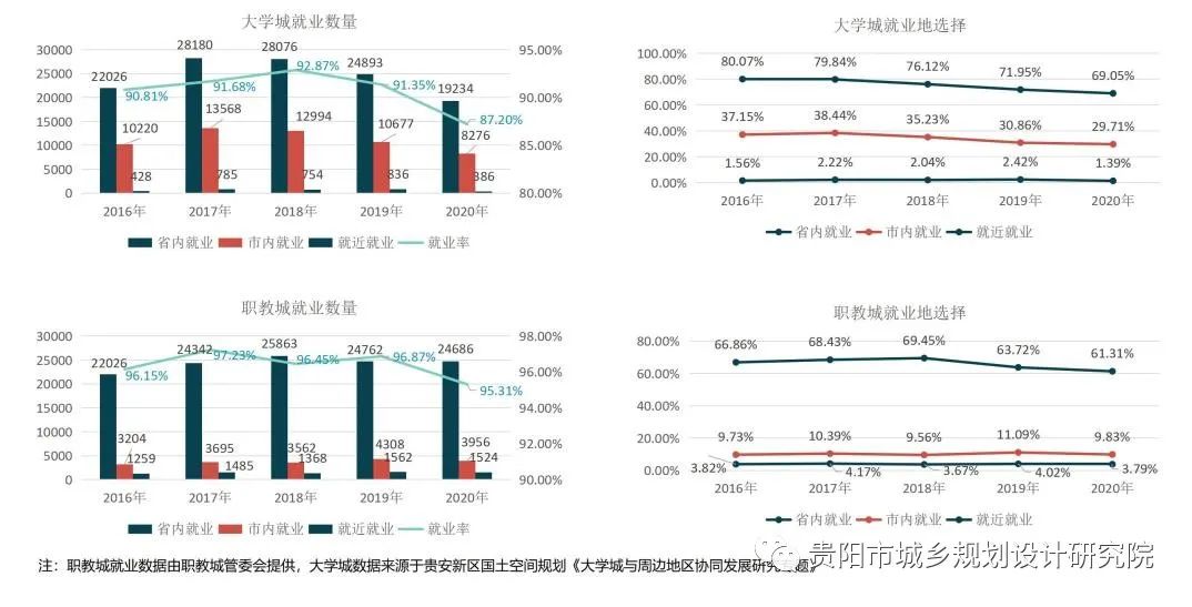通過數(shù)據(jù)分析“兩城”在省內(nèi)、市內(nèi)及融合片區(qū)就近就業(yè)率,發(fā)現(xiàn)大學(xué)城畢業(yè)生近5年就業(yè)率穩(wěn)定在90%上下,省內(nèi)及市內(nèi)就業(yè)的比例逐年下降,就近就業(yè)率均不足3%。職教城畢業(yè)生近5年就業(yè)率穩(wěn)定在95%以上,省內(nèi)就業(yè)率在60%-70%,市內(nèi)就業(yè)率在10%左右,就近就業(yè)率均不足5%。