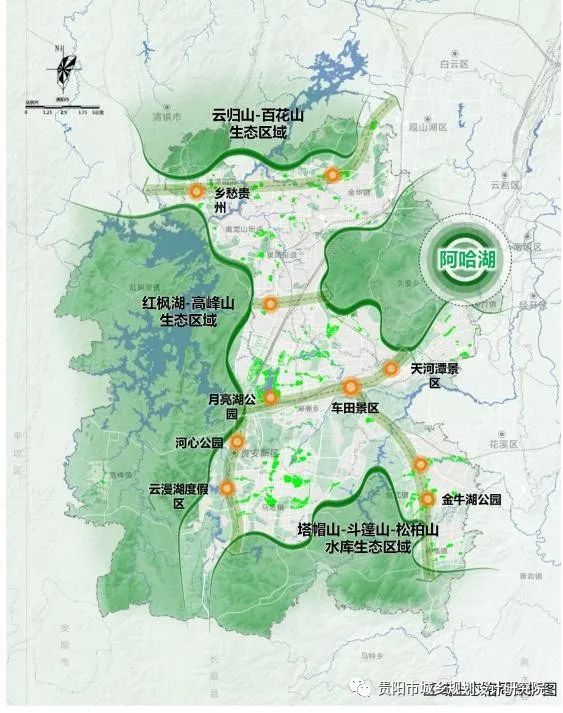 四片:紅楓湖-高峰山生態(tài)區(qū)域、云歸山-百花山生態(tài)區(qū)域、阿哈湖生態(tài)區(qū)域、塔帽山-斗篷山-松柏山水庫生態(tài)區(qū)域,強(qiáng)化區(qū)域生態(tài)保育功能,發(fā)揮區(qū)域生態(tài)基底作用。