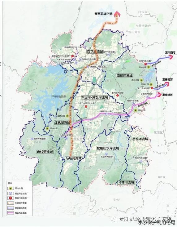 尾水收集:已建馬場至湖潮至南明河的貴安尾水通道,規(guī)劃沿紅楓湖、百花湖新建環(huán)湖綜合管廊,收集沿線朱家河、馬場、高峰、金華等10座污水處理廠尾水,排放至百花湖下游,減輕污水尾水對紅楓湖及百花湖的污染,排放標(biāo)準(zhǔn)為準(zhǔn)Ⅳ類水,計(jì)劃遠(yuǎn)期建設(shè)完成。新增金竹環(huán)阿哈湖南部截污管廊、大凹尾水通道,尾水采取跨流域排放模式,分別排放至市西河及南明河,減輕污水尾水對阿哈湖的污染,排放標(biāo)準(zhǔn)為準(zhǔn)Ⅳ類水,計(jì)劃近期建設(shè)完成。
