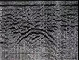 (4)管線深度和水平位置的確定:管線的深度可從雷達剖面圖上直接讀取,探地雷達系統(tǒng)自動把時間域轉(zhuǎn)換成空間域。電磁波在不同介質(zhì)中的傳播速度是不一樣的,在確定管線深度之前,最好在測量區(qū)域內(nèi)找一條已知管線進行傳播速度測試。管線的水平位置可由測量輪精確測得,而且探地雷達具有現(xiàn)場回拉定位功能,當屏幕上顯示出管線波形時(天線拖動方向與管線方向垂直時,典型波形反應(yīng)為拋物線),可將天線回拉,屏幕上將出現(xiàn)一個光標,隨著天線的回拉,光標在雷達剖面圖上移動,當光標移動,當光標移到拋物線頂點時,天線的中心位置對應(yīng)的就是該管線軸心的平面位置。
