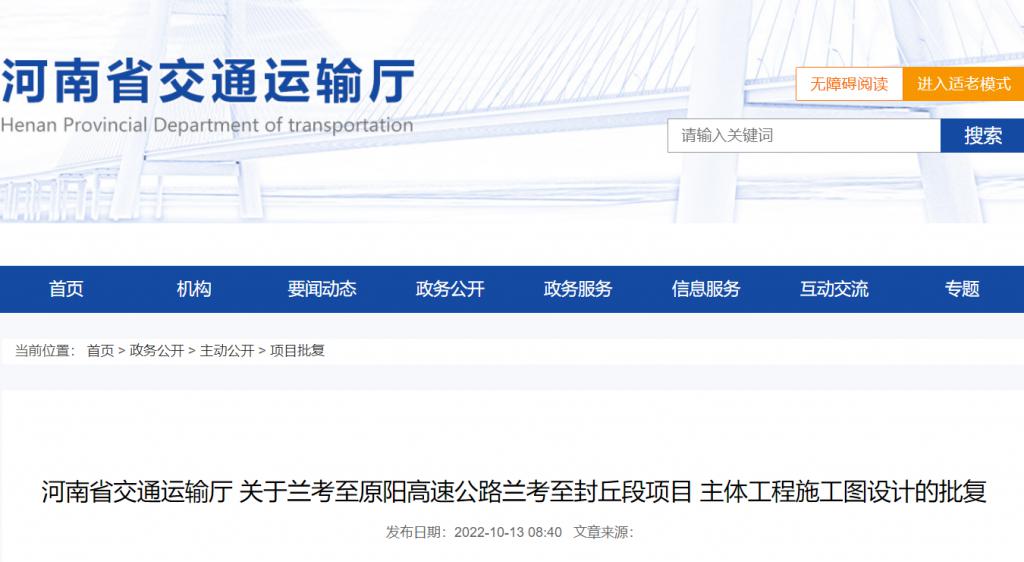 10 月 13 日,河南省交通運輸廳官方網(wǎng)站發(fā)布《關(guān)于蘭考至原陽高速公路蘭考至封丘段項目主體工程施工圖設(shè)計》的批復(fù)。