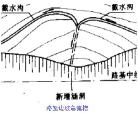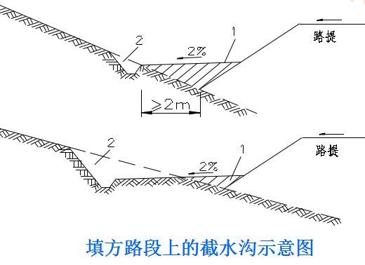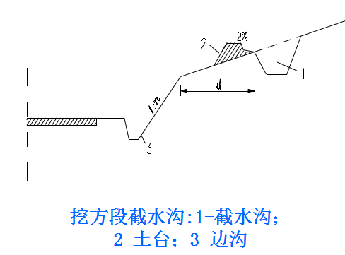 2.截水溝:又稱天溝,一般設置在挖方路基邊坡坡頂以外,或山坡路堤上方的適當?shù)攸c,用以攔截并排除路基上方流向路基的地面徑流。