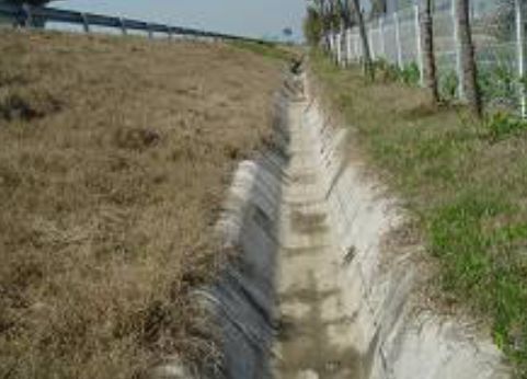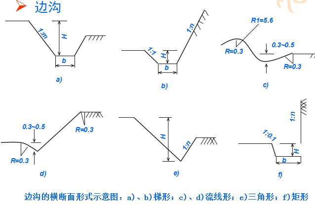 橫斷面:一般為梯形,溝的邊坡坡度,因巖土條件而定,一般采用1:1.0~1:1.5。溝底寬度b不小于0.5m,溝深h按設計流量而定,亦不應小于0.5m。