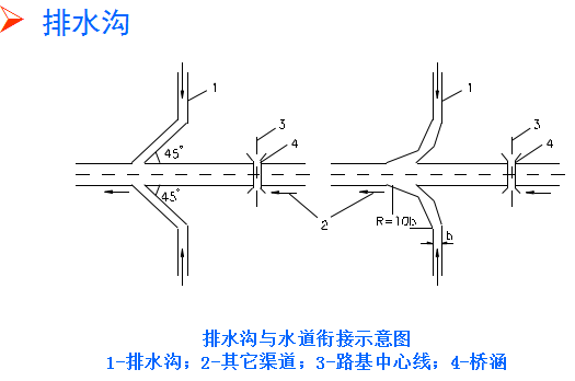 (3)排水溝水流注入其他溝渠或水道時,應使原水道不產(chǎn)生沖刷或淤積。通常應使排水溝與原水道兩者成銳角相交,交角不大于45?,有條件可用半徑R=10b(b為溝頂寬)的圓曲線朝下游與其它水道相接。
