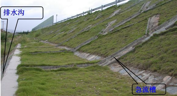 在路堤較高,邊坡坡面在未做防護而易遭受路面表面水流沖刷,或者坡面雖已采取防護措施但仍有可能受到?jīng)_刷時,應沿路肩外側(cè)邊緣設置攔水帶,匯集路面表面水,然后通過泄水口和急流槽排離路堤。