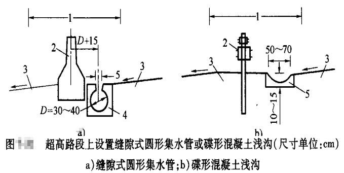 (1)寬度小于3m且表面采用鋪面封閉的中央分隔帶排水,降落在分隔帶上的表面水排向兩側(cè)行車道,其坡度與路面的橫坡度相同;在超高路段上,可在分隔帶上側(cè)邊緣處設置緣石或泄水口,或者在分隔帶內(nèi)設置縫隙式圓形集水管或碟形混凝土淺溝和泄水口,以攔截和排泄上側(cè)半幅路面的表面水。緣石過水斷面的泄水口可采用開口式,格柵式或組合式;碟形混凝土淺溝的泄水口采用格柵式。