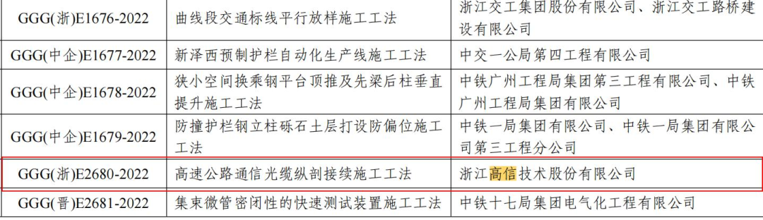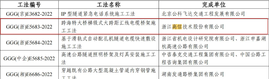 近日,中國公路建設(shè)行業(yè)協(xié)會(huì)公布了2022年度公路工程工法評審結(jié)果,浙江交通集團(tuán)高信公司申報(bào)的《高速公路通信光纜縱剖接續(xù)施工工法》、《跨海特大橋梯級式大跨距匯線電纜橋架施工工法》兩項(xiàng)工法通過評審,首次獲得部級工法的評定。