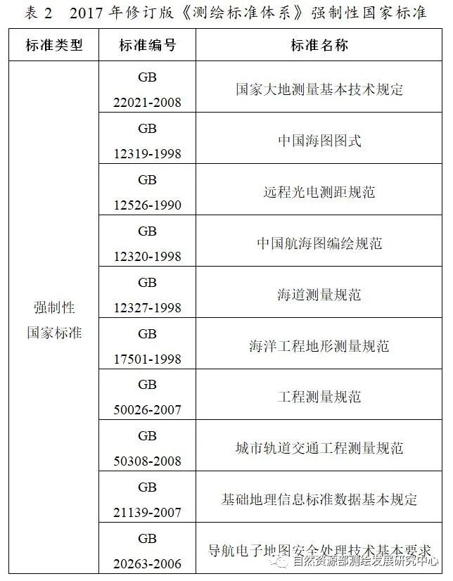 2017年原國家測繪地理信息局頒布實(shí)施了《測繪標(biāo)準(zhǔn)體系(2017修訂版)》,從信息、工程、企業(yè)、計(jì)算、技術(shù)等五個視角對測繪標(biāo)準(zhǔn)進(jìn)行分類和架構(gòu)。該體系劃分為“定義與描述”、“獲取與處理”、“成果”、“應(yīng)用服務(wù)”、“檢驗(yàn)與測試”和“管理”6大類共36小類,涵蓋了大地測量、攝影測量與遙感、地圖制圖與地理信息服務(wù)、海洋測繪、不動產(chǎn)測繪、界線測繪、工程測量等多個方面,共計(jì)收錄377項(xiàng)標(biāo)準(zhǔn)。截至該體系頒布,收錄強(qiáng)制性國家標(biāo)準(zhǔn)10項(xiàng)(見表2)。10項(xiàng)強(qiáng)制性標(biāo)準(zhǔn)中,依舊缺少與人民財(cái)產(chǎn)相關(guān)的強(qiáng)制性國家標(biāo)準(zhǔn)。