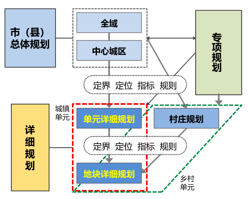 ?。ㄒ唬┲貥?gòu)“中心城區(qū)—單元—地塊”傳導(dǎo)層級(jí)。針對(duì)原控規(guī)承接傳導(dǎo)體系不健全情況,依據(jù)國土空間總體規(guī)劃,立足城鎮(zhèn)開發(fā)邊界和中心城區(qū)關(guān)系,重構(gòu)“全域空間—中心城區(qū)—單元—地塊”多層級(jí)、全覆蓋的傳導(dǎo)體系。明確單元作為市、縣國土空間總體規(guī)劃向詳細(xì)規(guī)劃傳導(dǎo)規(guī)劃內(nèi)容和要求的空間載體,是詳細(xì)規(guī)劃編制、管理、實(shí)施和監(jiān)督的基本單位,在國土空間總體規(guī)劃階段劃定。地塊則是詳細(xì)規(guī)劃管理和項(xiàng)目實(shí)施單位。