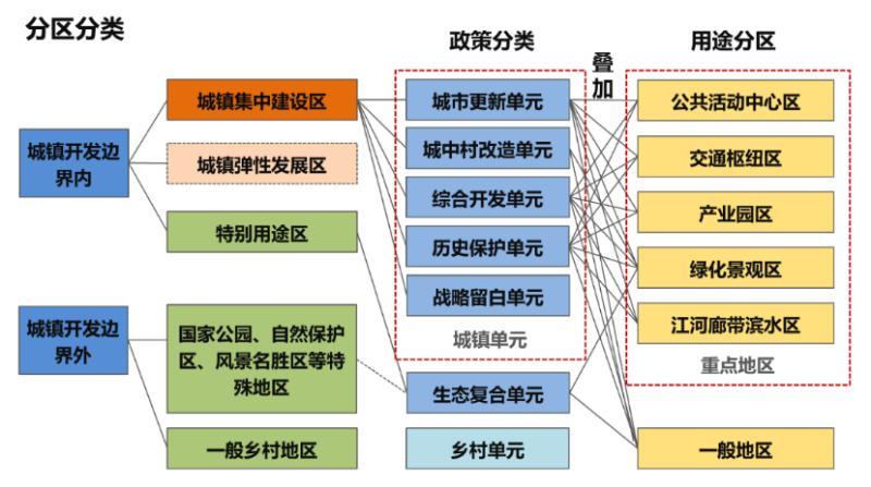 ?。ㄒ唬┐罱ㄓ猛痉謪^(qū)疊加分類政策多場景。立足國土空間全域全要素規(guī)劃管控要求,協(xié)調(diào)城鎮(zhèn)開發(fā)邊界內(nèi)外關(guān)系,劃分一般用途區(qū)和重點(diǎn)用途區(qū),其中重點(diǎn)區(qū)包括公共活動(dòng)中心區(qū)、交通樞紐區(qū)和江河廊帶濱水區(qū)等。在用途分區(qū)基礎(chǔ)上,疊加各類政策,明確城市更新、城中村改造、綜合開發(fā)、歷史保護(hù)、生態(tài)復(fù)合和戰(zhàn)略留白等類型單元,進(jìn)行分區(qū)分類指引,實(shí)現(xiàn)土地利用全生命周期、全利用方式的管控,保障相關(guān)政策得以落地。