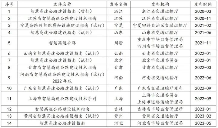 過去幾年,各個省份按照各自對智慧公路的理解,開展了部分智慧公路項目的建設(shè),并以此為經(jīng)驗積累,編制了適應(yīng)本省的智慧公路建設(shè)(技術(shù))指南,試圖為后期的智慧公路建設(shè)提供指導(dǎo)思想和發(fā)展方向。