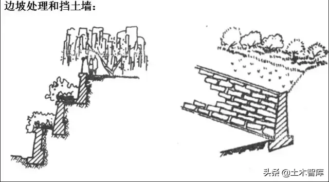 5)兩個(gè)的關(guān)系:護(hù)坡是建筑在邊坡上的附屬工程,是起保護(hù)邊坡不被雨水沖刷或邊坡綠化作用的,而擋土墻是為了保護(hù)高路基減少放坡或保護(hù)河道等作用,它們之間沒(méi)有特別的關(guān)系,有的護(hù)坡底角(力點(diǎn))作用在擋土墻上,它們可以是單獨(dú)的,也可以?xún)蓛上鄮鸵r,但護(hù)坡必須在邊坡上。