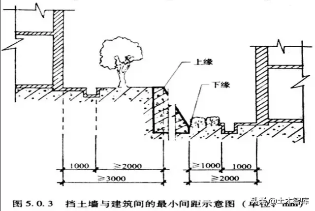 1、 居住區(qū)內(nèi)的擋土墻與住宅建筑的間距應(yīng)滿(mǎn)足住宅日照和通風(fēng)的要求; 2 、高度大于2m的擋土墻和護(hù)坡的上緣與建筑間水平距離不應(yīng)小于3m,其下緣與建筑間的水平距離不應(yīng)小于2m。