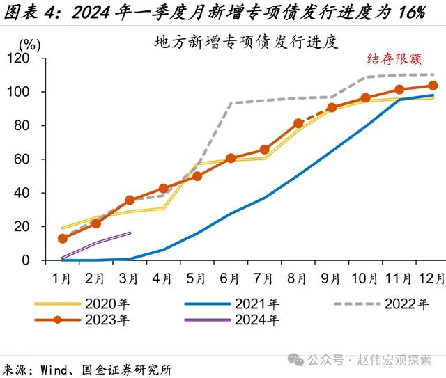 不過,今年以來專項債發(fā)行進度明顯慢于去年。公開數(shù)據(jù)顯示,2024年一季度,地方新增專項債共發(fā)行約6341億元,同比下降約53%,已發(fā)行額度占全年新增專項債額度比重(發(fā)債進度)僅16%,遠低于去年同期的35%。而4月份以來專項債發(fā)行也并未出現(xiàn)明顯提速跡象。