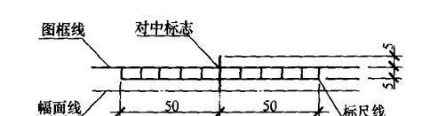 (2)需要縮微后存檔或復制的圖紙,圖框四邊均應具有位于圖幅長邊,短邊重點的對中標志(圖2-1),并應在下圖框線的外側(cè),繪制一段長100cmm標尺,其分隔為10mm。對中標志的線寬宜采用大于或等于0.5mm,標尺線的線寬宜采用0.25mm的實線繪制(圖2-2)