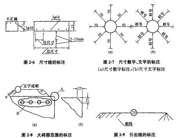 (4)尺寸線必須與被標注長度平行,不應超出尺寸界線,任何其他圖線均不得作為尺寸線。在任何情況下,圖線不得穿過尺寸數(shù)字。相互平行的尺寸線應從被標注的圖形輪廓線由近向遠排列,平行尺寸線間的間距可在5-15mm之問。分尺寸線應離輪廓線近,總尺寸線應離輪廓線遠(圖2-6)。