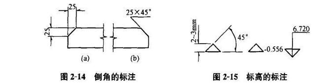 (12)倒角尺寸可按圖2-14 (a)標注,當?shù)菇菫?5“時,也可按圖2-14(b)標注。