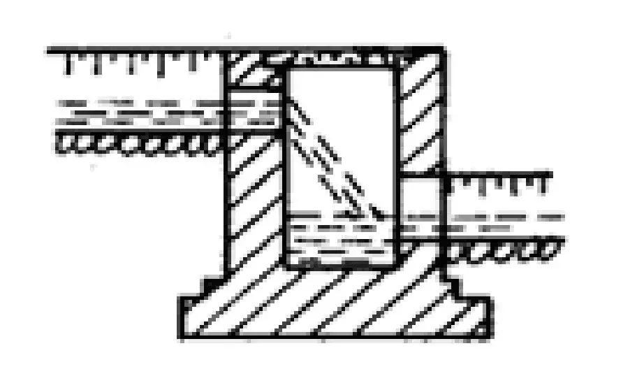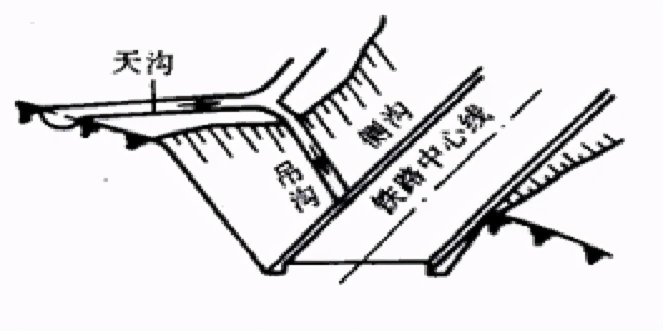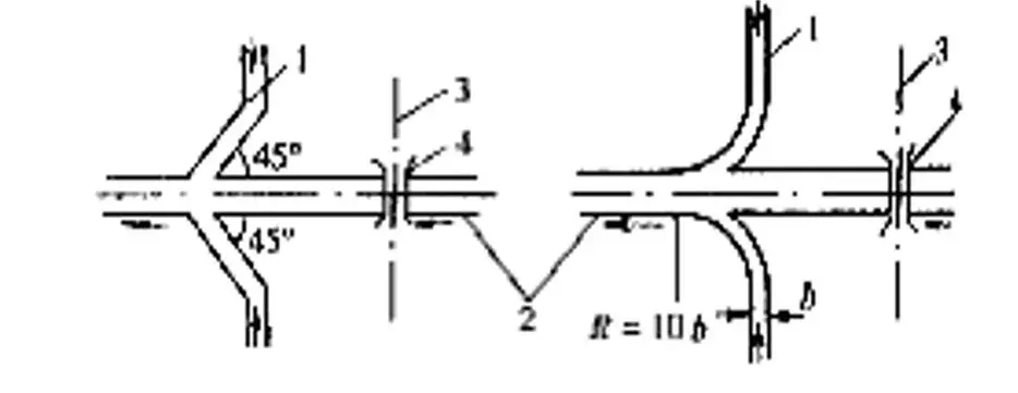 排水溝與其他溝渠相接時應(yīng)力求水流舒順,因地形限制成直角相交時,可按下圖形式處置: