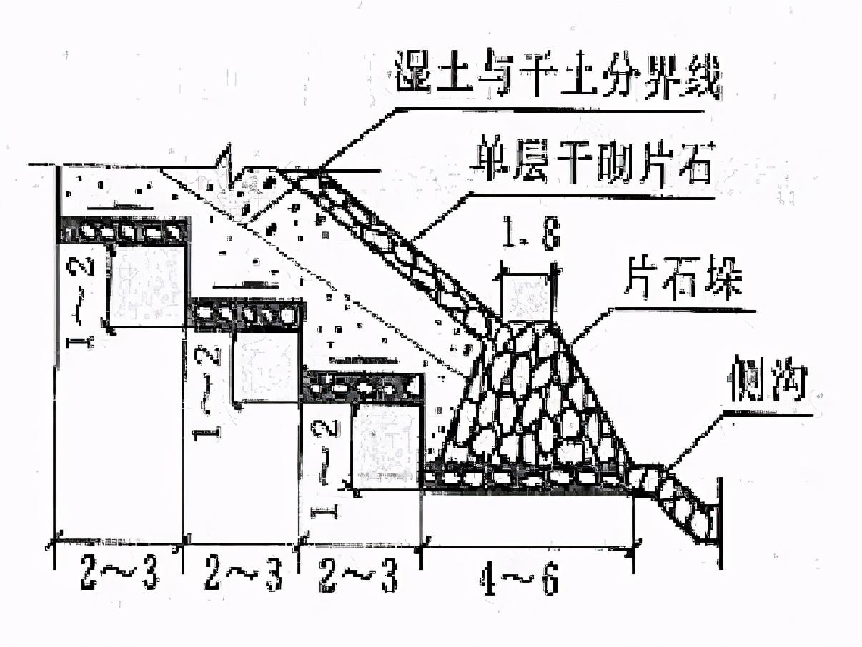 - 防滲的方法:表層夯拍,三合土、四合土捶面,漿砌片石護(hù)面及用混凝土水槽等,對于采用卵石護(hù)面或干砌片石護(hù)面的水溝,也可在其底層用粘土夯鋪一層厚0.2~0.3m的土層;